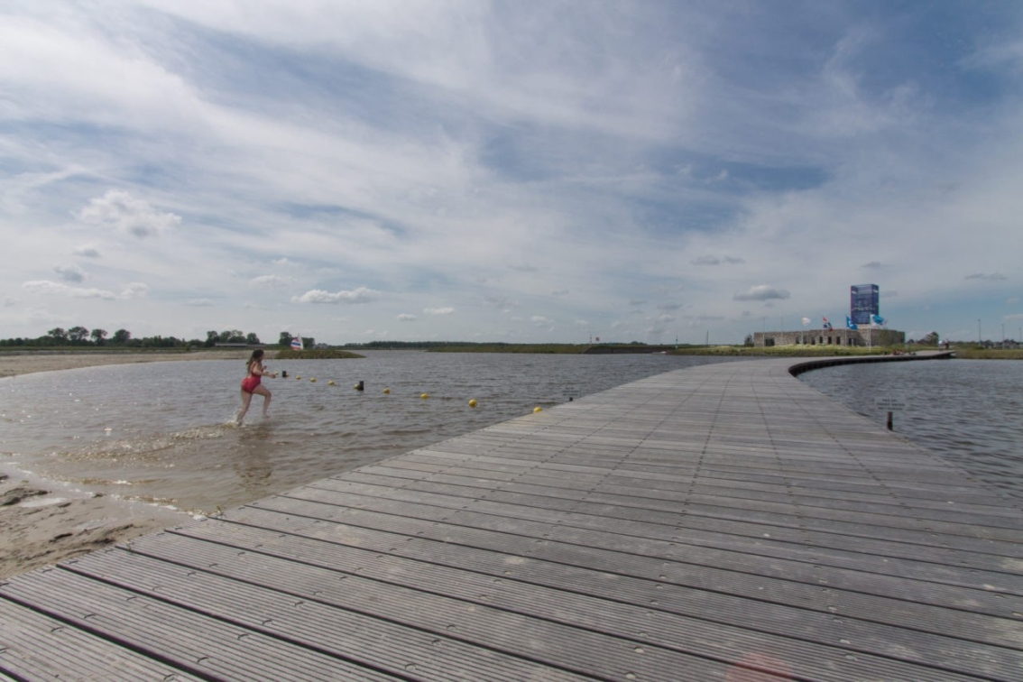 De boulevard loopt over in een 100 meter lange houten voet- en fietsbrug. Deze brede, houten vlonder leidt bezoekers in één vloeiende beweging naar het strand aan de overkant van het water. Het strand is vormgegeven als halfbesloten baai, en is zo gesitueerd dat het een mooi uitzicht biedt op het meer en de jachthaven. De ligging maakt het strand goed zichtbaar en bereikbaar vanuit de (woon)omgeving, waarmee de exclusieve kwaliteiten van het gebied benadrukt worden. Tegelijkertijd zitten door deze ligging de toekomstige woonomgeving en het toeristische gebruik elkaar niet in de weg.