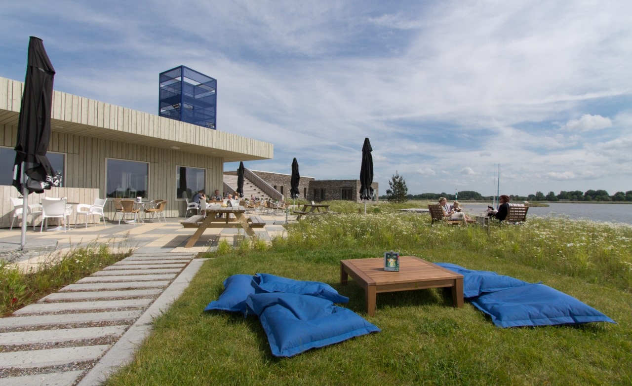 Het aan de boulevard gelegen havengebouw vormt het centrale punt in het havengebied. De voorzieningen in het gebouw (sanitair, havenkantoor, nautische winkel en horeca) bedienen zowel de haven als het strand. De buitenruimte van het havengebouw is vormgegeven als tussenvorm tussen een tuin en een duinlandschap. De verharde buitenruimte direct rondom het havengebouw is opgezet als één doorlopend, flexibel terras en de overgang naar de openbare ruimte is vloeiend en vanzelfsprekend. De verschillende toeristische functies (en toekomstige openbare functies) in het gebouw hebben hierdoor een toegankelijke, uitnodigende uitstraling. Ook kunnen door de open opzet terrassen makkelijk met de bezonning meebewegen. Tot slot geeft deze opzet veel flexibiliteit bij toekomstige functieveranderingen van het gebouw.