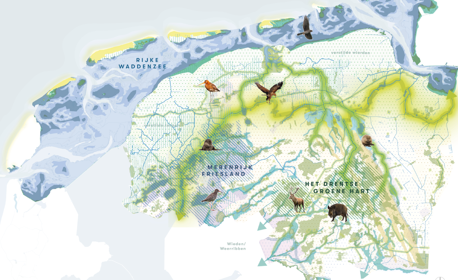 Het watersysteem is de onderlegger van het plan, in nauwe interactie met reliëf en bodem. Herstel van het natuurlijk watersysteem in het Noorden vormt de basis: van ‘veen tot zee’. Het Drents Plateau kan veel meer dan nu benut worden als dé strategische grondwatervoorraad voor heel Noord-Nederland. Hiervoor moet het watersysteem veranderen: van een focus op afvoeren naar een focus op vasthouden. Met dit als fundament is er inzicht gegeven hoe andere thema’s de komende decennia vorm kunnen krijgen. Denk hierbij aan de natuuragenda, de landschapsagenda, koppelkansen, voedselketens, wonen en werken, energie, toerisme en recreatie.