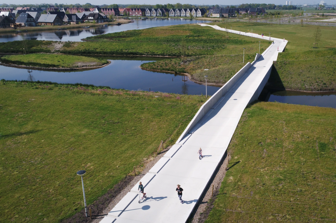 Een ander voorbeeld dat bijdraagt aan de hedendaagse opgaven is het ontwerp voor het Groningse Park Meerstad, waar met weinig ingrediënten een ijzersterk beeld is neergezet. Grondheuvels met inheemse beplanting zorgen voor afwisseling en biodiversiteit. Eén pad dat als een waterpas door de heuvels ligt zorgt voor een heldere lijn en rust in het park. Het hele parkprogramma is integraal vormgegeven met dezelfde ontwerpprincipes. Zo ontstaat harmonie én spanning.