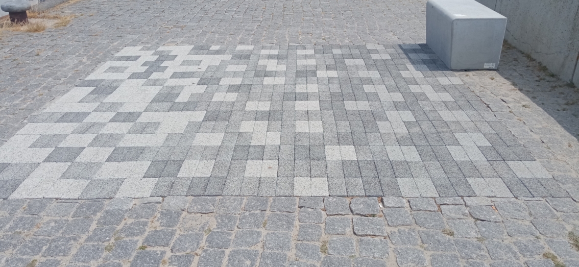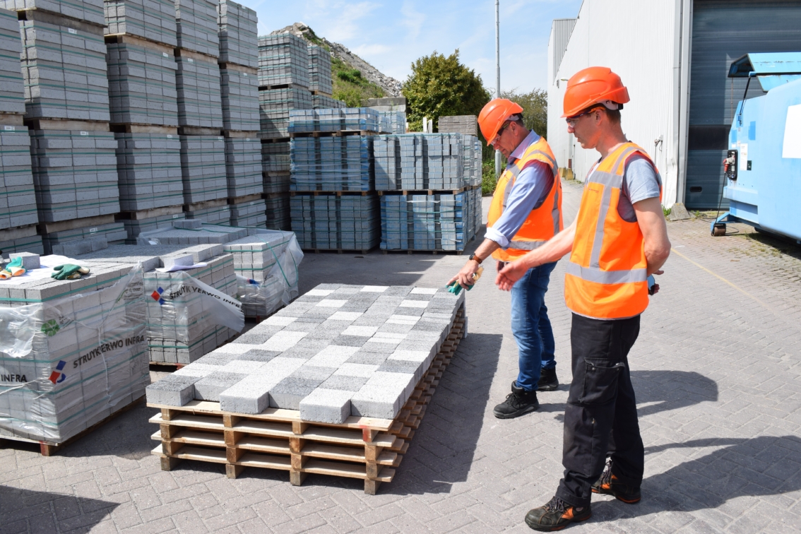 Met dank aan Struyk Verwo Infra konden we op hun fabrieksterrein in Tiel de door ons geselecteerde stenen in verschillende patronen in een proefopstelling samenstellen. Met het verhardingsontwerp voor het Werelderfgoedcentrum willen we door verschillende zwemen van grijstinten een referentie maken naar het droogvallend wad. Door verschillende combinaties en mixen te testen hebben we de juiste samenstelling kunnen maken. Nu gaan we door met detailleren en daarna bouwen.